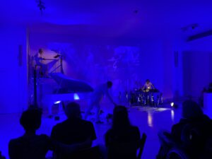 Konzertperformance mit obligaten Bohrmaschinen, Sprecher und Kammerensemble und visueller Rückkopplung. Auf Ständern stehende Bohrmaschinen, die verschiedentlich steuerbar sind, beginnen sich zu bewegen. Sounds entstehen. Brummen, Stottern, Wimmern. Werden abgenommen und verändert. Bilder entstehen. Aus dem blauen Tuchbesatz auf den sich drehenden Bohrmaschinenspitzen erscheinen Rosetten: Da ist sie, die Blaue Blume! Und da sind auch Wort und Klang: eine tiefenentspannte Violine, Sternenzacken im Sprachstaccato, die rückkoppelnde Gießkanne, Flautando und Koloratur. Das alles verdichtet sich in Videobildern, die wiederum als grafische Notation von den Musikern aufgenommen werden – Rückkopplungen. Alles gerät in den Strudel – ein ekstatisches Klangspiel beginnt. Wolfram Meier (Bohrmaschinen), Anne Roemer (Sopran, Flöten), Fx Schroeder (Singsang, Instrumentarium), Hans-Christian Jaenicke (Violine), Gerhard Fiedler (Wort, Verse), Lorenz Staffeldt (visuelle Rückkopplung/Videoprojektion).
